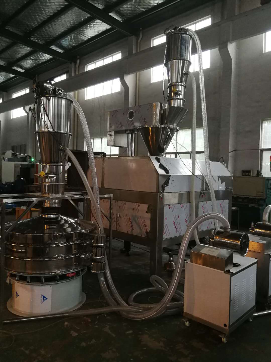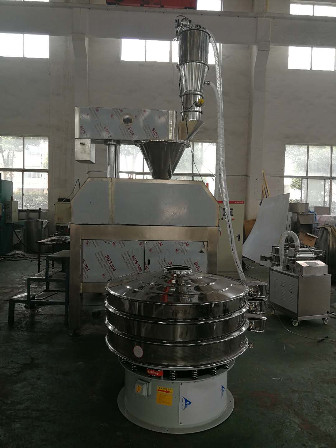 4、 整粒部分由變頻調速電设备拖動整粒刀旋轉將片狀物料整形成所需的块状在網孔中排出。