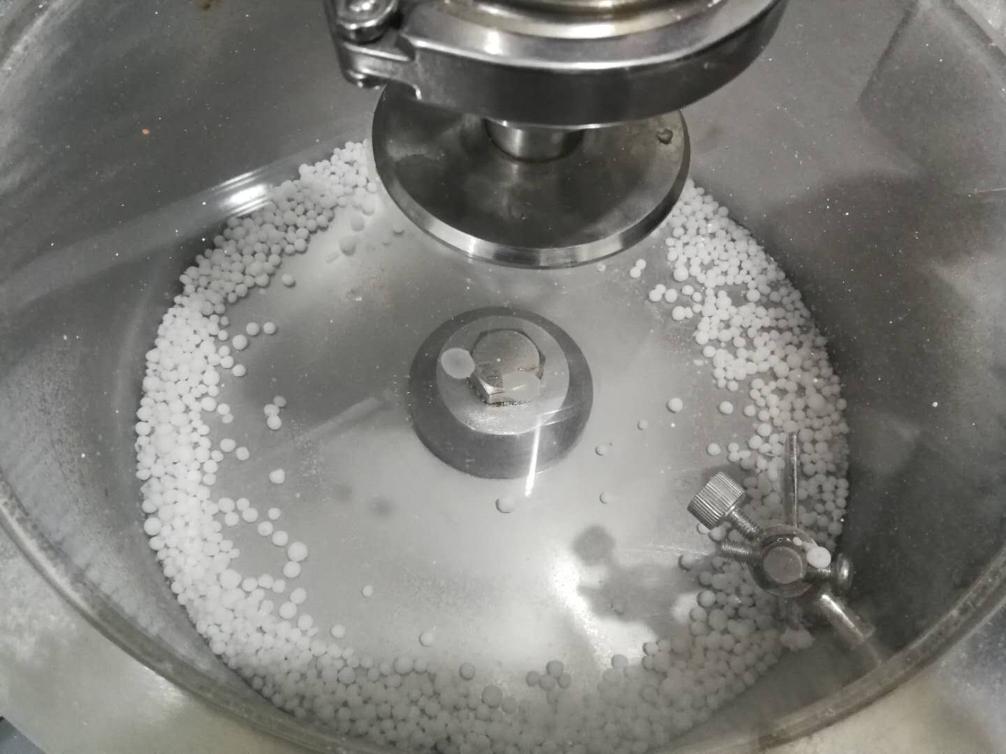 本设备是通過設置旋轉離心盤、鼓風设备、氣動噴槍,將濕块状製成美麗的球丸。將前道工序做成的濕块状投入旋轉離心盤內,啟動鼓風设备後再將旋轉離心盤啟動,使濕块状受到環隙空氣浮力、旋轉離心力、自身重力作用,呈環周繩股狀運動,從而形成真球度極高的球丸。