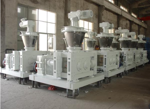 各種幹粉物料從設備頂部加入,經脫氣、螺旋預壓進入對輥,在對輥極大的擠壓力作用下使物料產生塑性變形而被壓縮成片狀。片狀物料再經過破碎、整粒、篩分等過程,得到块状狀產物。擠壓力的大小可根據造粒操作的需要由液壓油缸的壓力進行調節。