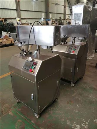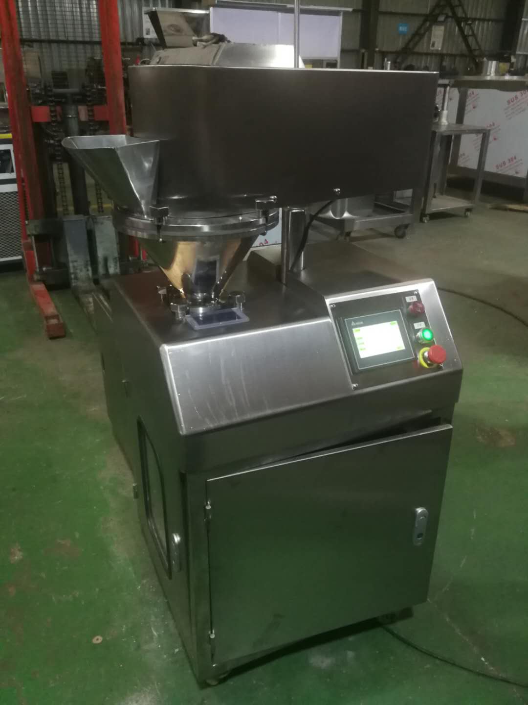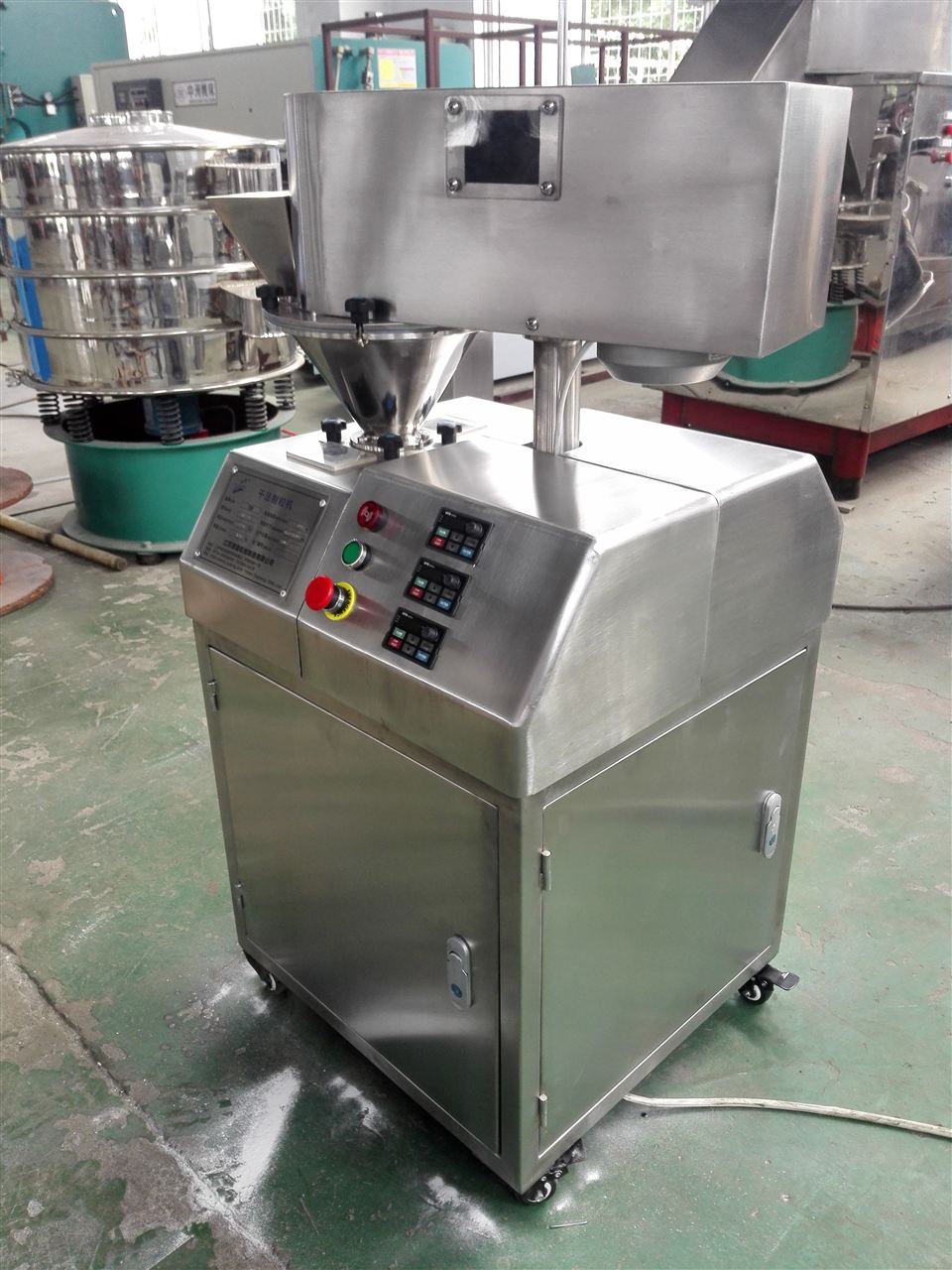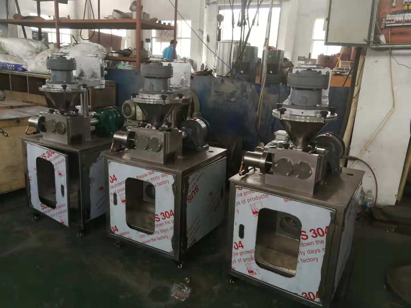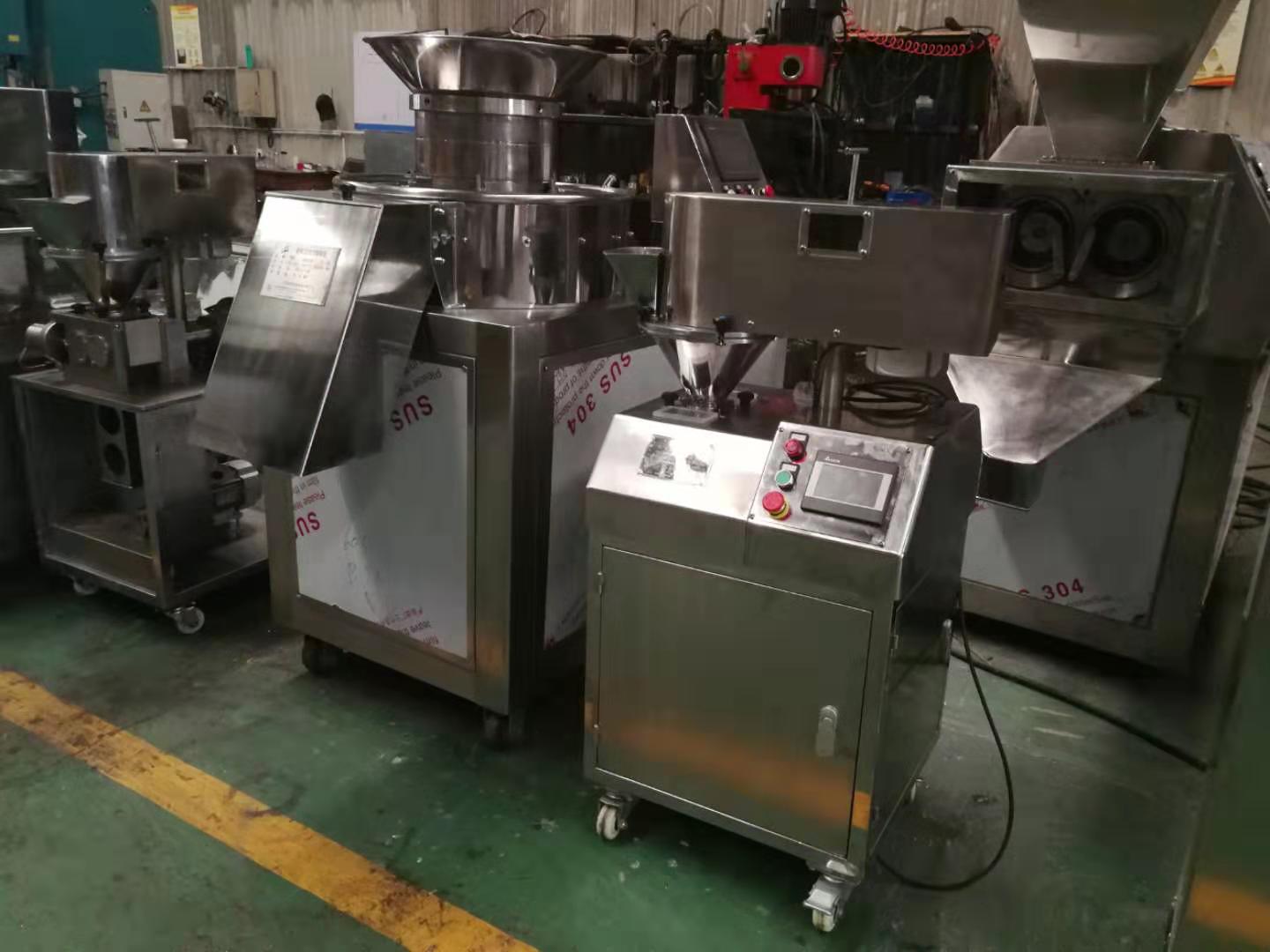 本设备有送料设备構、壓片设备構、液壓设备構、设备架和電氣控製等部件組成,送料,壓片、製粒均采用變頻無級調速,油泵壓力可調,成物細度可以通過更換不同的篩網獲得。改進製粒轉籠,增加了块状的成物率。本设备裝拆、清洗方便,與物料接觸部分皆為不鏽鋼製作。產物符合GMP要求。物料由頂部送料漏鬥加入,經兩壓輪強製擠壓成片狀後進入下部製粒室,在製粒室中片狀物料被製粒刀片打碎,然後進入整粒室,直至块状小於或等於網孔徑,块状通過網篩到盛料托盤。所需要块状大小可以通過調整篩網大小來決定。