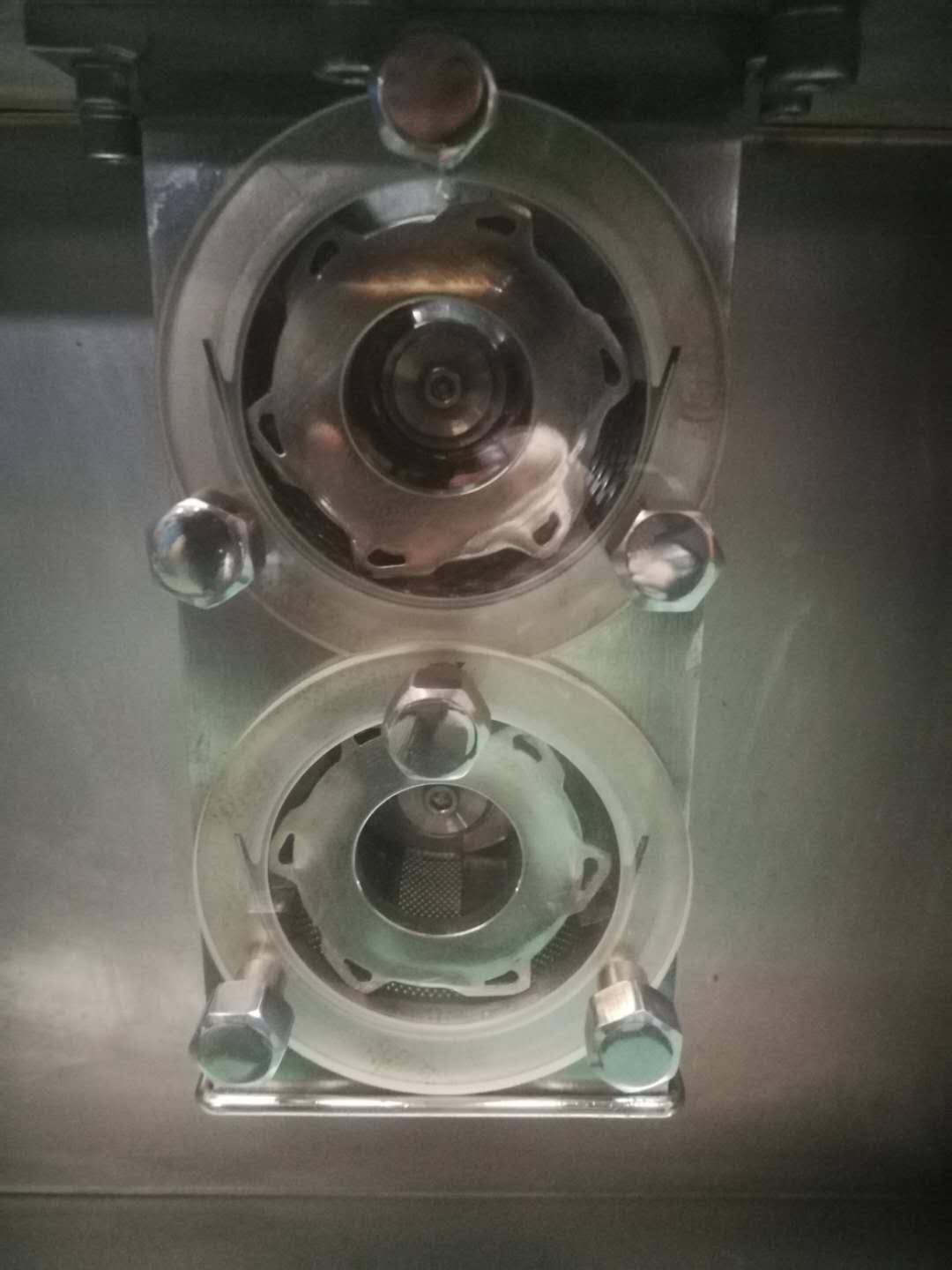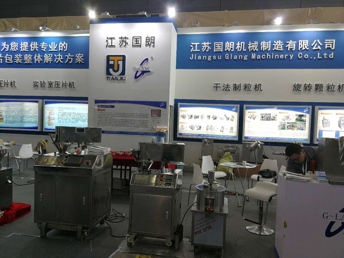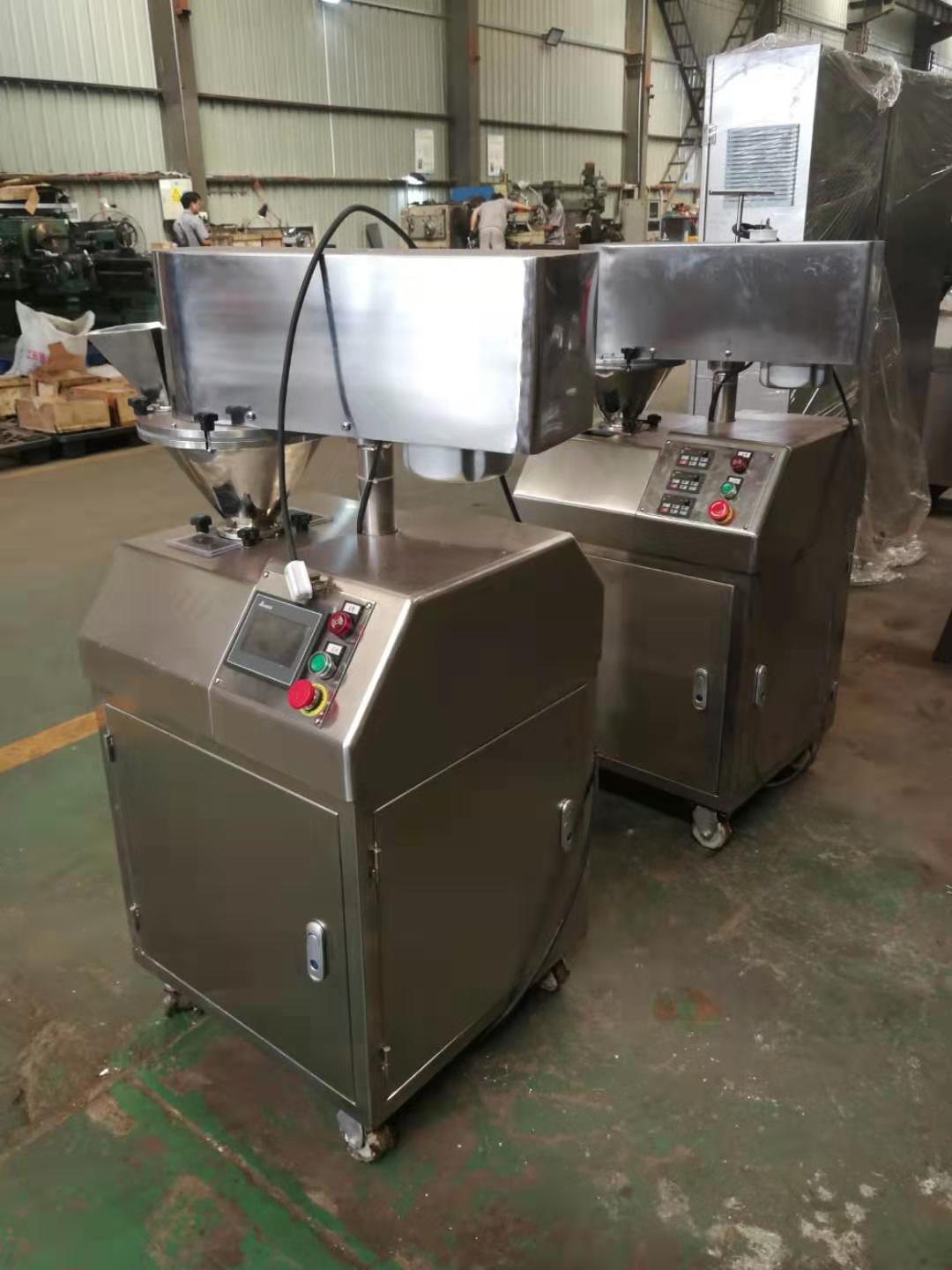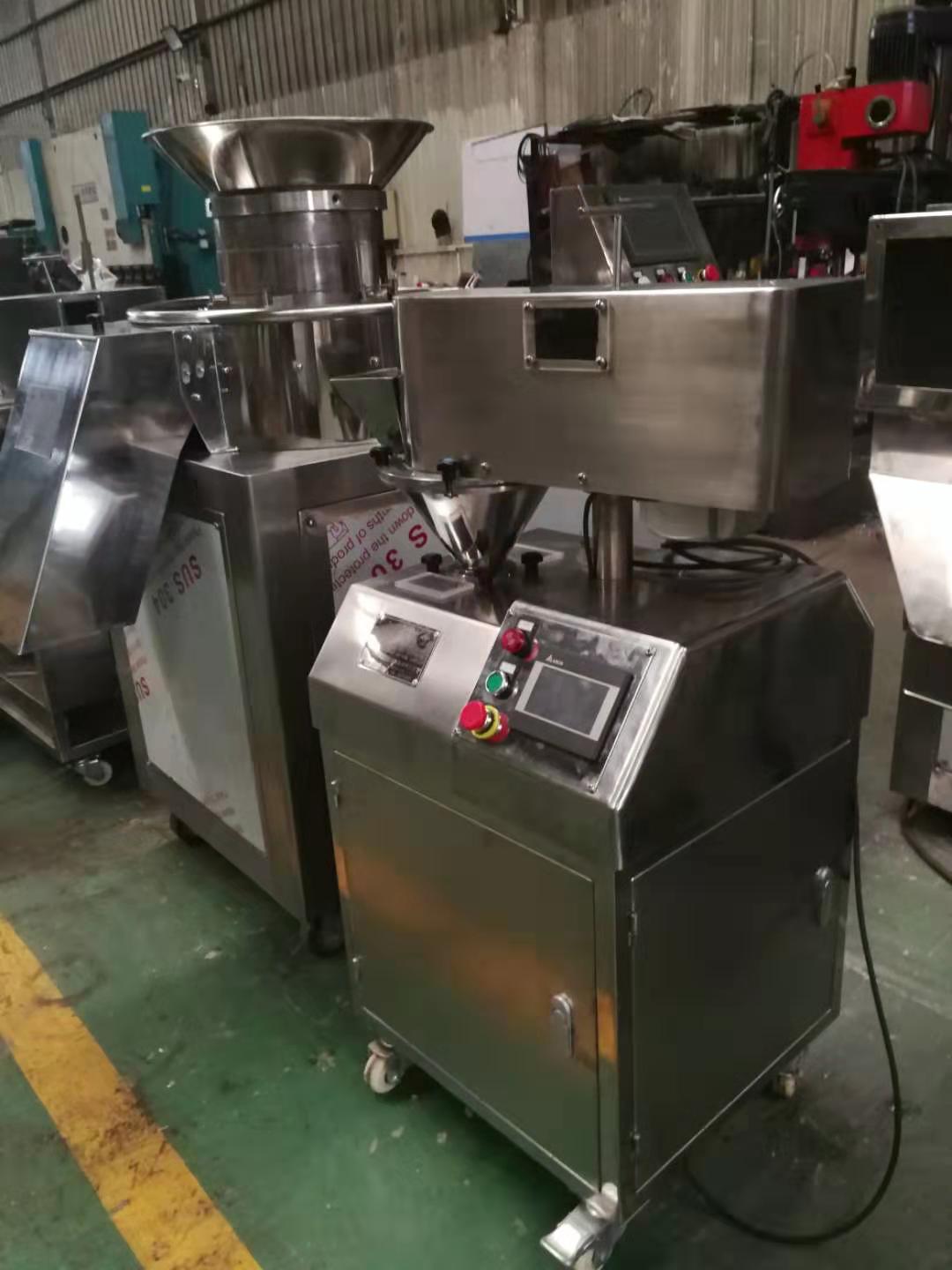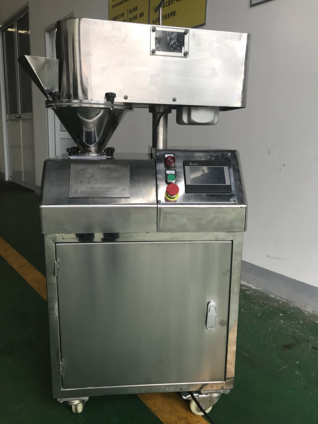 本设备有送料设备構、壓片设备構、液壓设备構、设备架和電氣控製等部件組成,送料,壓片、製粒均采用變頻無級調速,油泵壓力可調,成物細度可以通過更換不同的篩網獲得。改進製粒轉籠,增加了块状的成物率。本设备裝拆、清洗方便,與物料接觸部分皆為不鏽鋼製作。產物符合GMP要求。物料由頂部送料漏鬥加入,經兩壓輪強製擠壓成片狀後進入下部製粒室,在製粒室中片狀物料被製粒刀片打碎,然後進入整粒室,直至块状小於或等於網孔徑,块状通過網篩到盛料托盤。所需要块状大小可以通過調整篩網大小來決定。