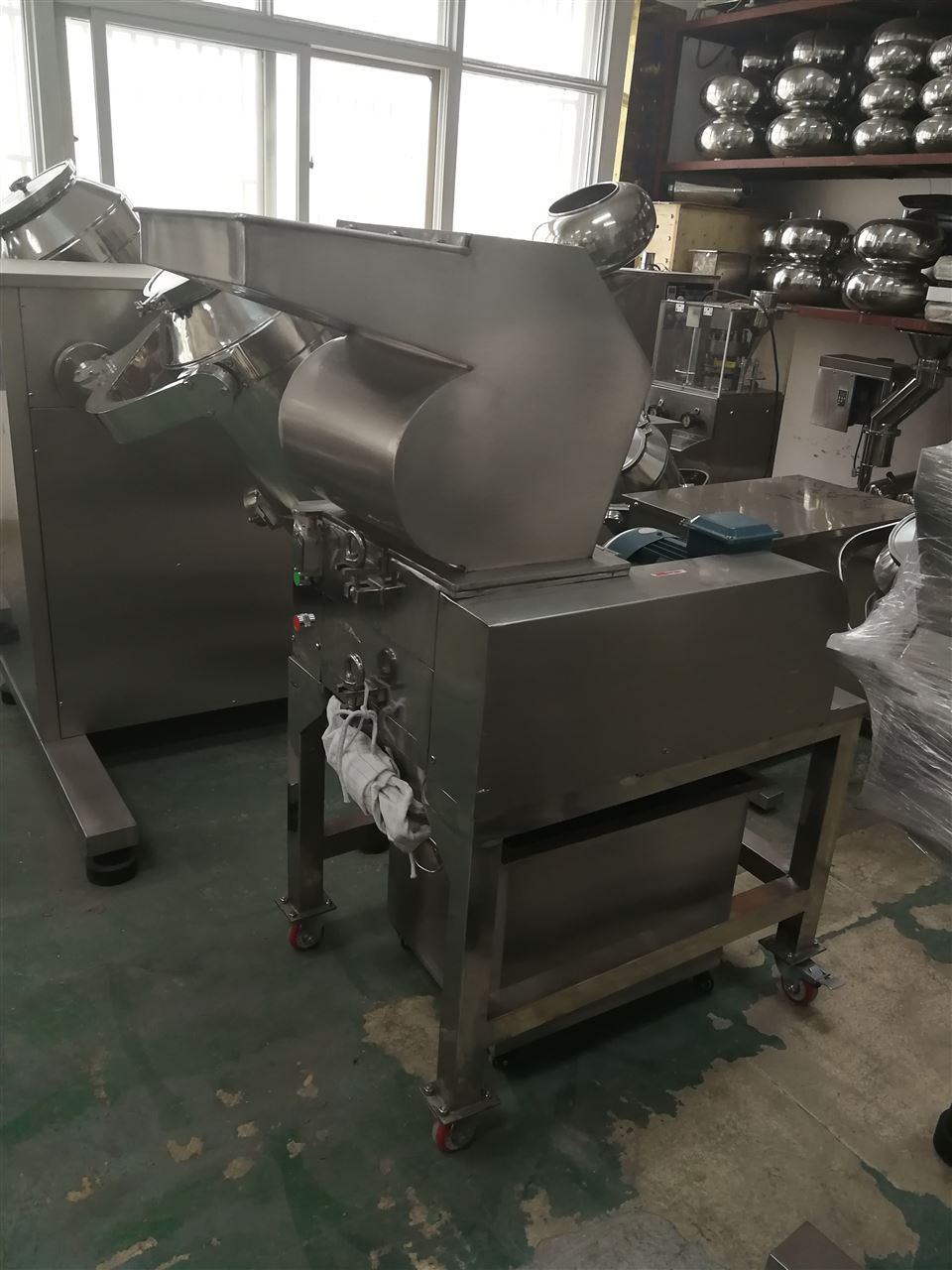 本粉碎设备為立式結構,物料由粉碎设备進料鬥進入粉碎室,利用旋轉刀旋轉衝擊,固定刀和活動刀同時剪切而獲得粉碎,經旋轉離心力的作用,物料自動流向粉碎设备出口處。另外符合GMP”標準設計,粉碎设备整设备全部采用不鏽鋼材料製造,使藥物,食物等能符合國家衛生要求。